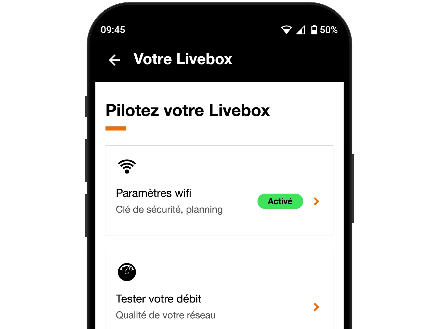 Répéteur Wifi 6 : Les répéteurs restent la propriété d’Orange. Le nombre de répéteurs nécessaires dépend de la taille de votre logement. Le répéteur permet d’étendre la couverture wifi de votre Livebox en Wi-Fi 6 ou de remplacer le Wi-Fi 5 de la Livebox 5 par du Wi-Fi 6 (avec équipement compatible). Connexion Wi-Fi avec Décodeur compatible : TV UHD 4K et TV 4. Le 1er répéteur est accessible sur demande sur orange.fr pour les offres Up et Max, et les 2 répéteurs supplémentaires sur Max sont accessibles de manière séparée chaque 72h après la demande précédente. L’accès aux répéteurs n’est pas cumulable avec les répéteurs accessibles via les autres offres.